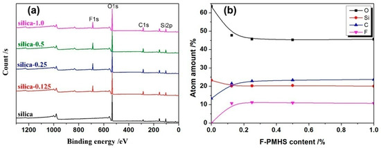 It is difficult to demonstrate the existence of amphiphobic–CF3 groups by FTIR because its absorption bands are similar to those of –CH3 [23]. So the characterization of XPS is carried out further. And before XPS characterization, the modified SiO2 ARCs were washed with hexane three times to remove unreacted F-PMHS. XPS spectra of ARCs and corresponding atomic amounts of O, Si, C, and F as a function of F-PMHS content are represented in Figure 2a,b. As shown in Figure 2a, the ARCs consists of O, Si, and C elements before F-PMHS modification [24,25], while there is an additional F element after F-PMHS modification [26]. As shown in Figure 2b, the atomic amounts of C and F for silica ARCs are 13.35% and 0, respectively, which are increased to 21.53% and 10.71% after being modified by 0.125% F-PMHS. At the same time, the atomic amounts of O and Si decrease from 63.43% and 23.22% to 47.4% and 20.07%, respectively. This is in good agreement with the results from FTIR. It is the F-PMHS grafted onto the ARCs that results in this change in atomic amounts.