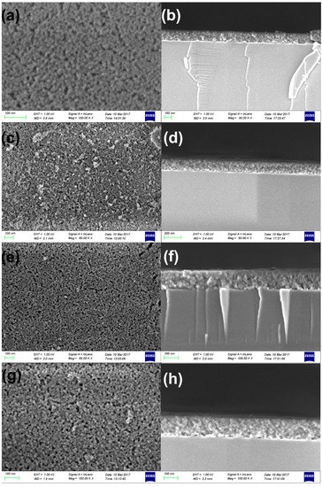 Top-view and cross-sectional SEM images of ARC modified F-PMHS at content of 0.0% (a,b), 0.25% (c,d), 0.5% (e,f), and 1.0% (g,h).