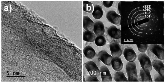 TEM characterization of the TiO2-coating on Ox-NPAM + TiO2 is shown in Figure 2, indicating that the ALD deposits exhibit a nanocrystalline structure, which can be indexed to anatase phase of titanium dioxide [21], similar to that reported in the literature for ALD deposited TiO2 films. Despite the lower deposition temperature employed in our work [8,10] and the fact that our samples were not annealed after deposition [11,12], our results are in good agreement with those obtained for the same precursors and deposition temperature [16]. The thickness of the ALD deposit can be estimated from TEM images by the measurement of TiO2 nanotube wall thickness as shown in Figure 2a [12], and it takes values around 5 nm in good agreement with manufacture condition previously indicated.