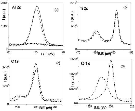 (a) Al 2p core level spectra for Sf-NPAM (solid), Ox-NPAM (dash), Sf-NPAM + TiO2 (dotted dotted), Ox-NPAM + TiO2 (dotted dash); (b) Ti 2p core level spectra for Sf-NPAM + TiO2 (solid), Ox-NPAM + TiO2 (dash). Comparison of core level spectra for Ox-NPAM (dotted) and Ox-NPAM + TiO2 (dotted dash): (c) C 1s and (d) O 1s.