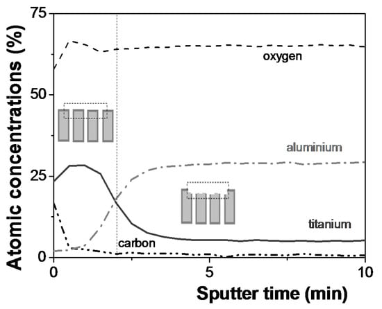 Depth-profile analysis for the TiO2-coated NPAMs was also performed for analyzing the chemical changes associated with the TiO2-coverage. Figure 4 shows the variation of the titanium, aluminium, oxygen and carbon atomic concentrations as a function of the sputtering time for the Ox-NPAM + TiO2 sample. From these results, and taking into account the different sputtering-time factors for pure materials, a thickness of around 6 nm was estimated for the deposited TiO2 superficial layer. They also show the very superficial character of the environmental carbon contribution (<3 nm) associated with atmospheric contamination and the increase in titanium (16%) and oxygen (12%) percentages with environmental carbon contamination reduction during approximately the first minute of the sputtering process. Moreover, the presence of TiO2-coating along the pore-walls can also be inferred from these results, according to the constancy of titanium atomic concentration with the sputtering time (or depth-profile) as it is schematically indicated in the insert of the Figure 4, in agreement with those previously obtained by using local energy dispersive X-ray spectroscopy (EDS) analysis [23].
