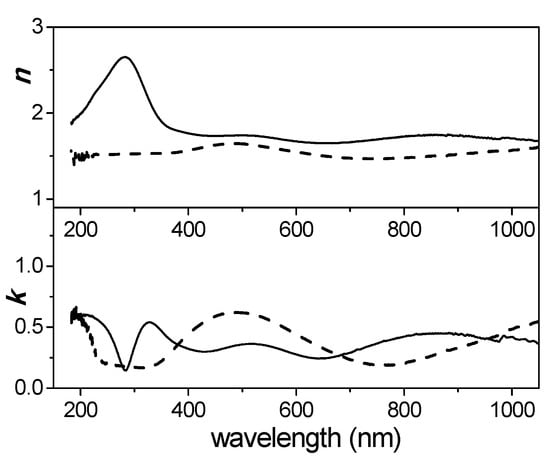 Wavelength dependence of the refraction index, n, and the extinction coefficient, k, for the Ox-NPAM (dashed line) and the Ox-NPAM + TiO2 (solid line).
