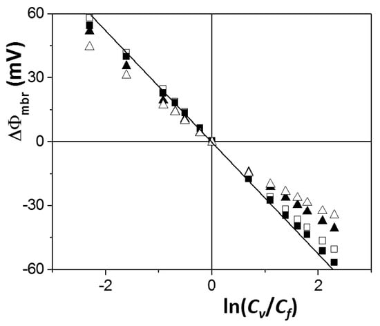 As it is well known, transport of solutions across nanoporous membranes (or nanostructures) is a research field of significant importance with technological applications in microfluidics, drug delivery or nanofilters [28,29]. Diffusive transport of saline solutions across membranes is usually characterized by the effective fixed charge concentration in the membrane (Xef) and the ionic transport numbers (ti), which represents the fraction of the total current flowing through the membrane transported for one ion (ti = Ii/IT), or the diffusion coefficients (Di) related to ti through the following electrochemical relationship: Di = ti/(t+ + t−), for 1:1 electrolytes [30]. Membrane (or solid structure) equivalent fixed charge might avoid/reduce the transport of co-ions (ions of equal sign as the charged solid surface) and favor the diffusive transport of counter-ions, which usually affects the transport number of ions or charged species across porous structures and, consequently, modifies the diffusion potential in the membrane [31]. Moreover, the charged membrane/solid matrix also affects the ions distribution at both solution/solid interfaces, associated with Donnan equilibrium (Donnan potential). According to the Teorell–Meyer–Sievers (TMS) model [32,33], the equilibrium electrical potential difference between the two electrolyte solutions of concentrations (Cf and Cv) separated by a membrane or membrane potential can be expressed by [34]: