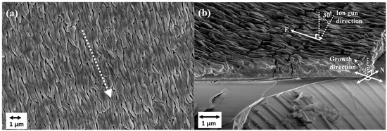 Scanning Electron Microscope low-magnification images: (a) Top view of as-synthesized ZnO film on glass substructure, where the white arrow indicates the projection of the incident flux on the film; (b) Cross-sectional view of the sample, where the ion flux and growth direction are denoted. Adapted with permission from [33]; Copyright 2013 Elsevier.