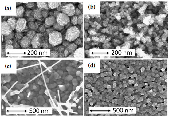 Surface morphologies of Zn films deposited on glass substrates with magnetron sputtering: (a) Ar, 2 mTorr; and (b) Ar + O2, 2 mTorr. Surface morphology of ZnO films formed by thermal oxidation of Zn films at 600 °C in air for 1 h: (c) deposited in Ar, 10 mTorr; and (d) deposited in Ar + O2, 10 mTorr. Adapted with permission from [35]; Copyright 2005 Elsevier.