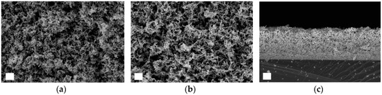 In a similar way, porous nanobranched ZnO thin films with average thicknesses ranging from few μm up to tens of μm, were easily fabricated by a two-step synthetic approach, involving RF magnetron sputtering of metallic Zn films and their oxidation by thermal annealing in ambient air a 380 °C for 2 h [36] or alternatively, by low-temperature water-vapor oxidation treatment [37]. The synthesis of metallic Zn films was performed at room temperature in a pure Ar atmosphere, using very mild conditions in terms of applied RF signal, Ar flow and pressure. In this way, a porous metallic network with a very high surface area was obtained still from the beginning of the synthesis process (Figure 3a), and was completely preserved after the oxidation treatments mentioned above (Figure 3b,c).
