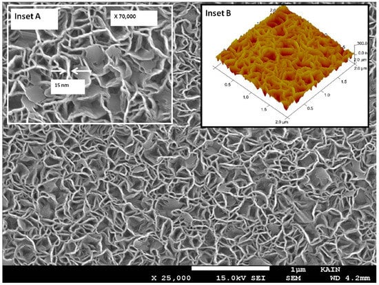 The combination of effects from both oxygen-pressure and substrate temperature on the growth of ZnO thin films by PLD was also demonstrated. This approach was exploited to prepare high surface area, three dimensional (3D) ZnO nanowall networks with a nest-like structure, shown in Figure 4 [51]. The nanowall structure was obtained by a two-step PLD process. This involved first the deposition of a thin ZnO seed layer at a substrate temperature of 300 °C and O2 pressure of 10 mTorr. Then, the 3D nanowall ZnO network was obtained at 550 °C and O2 pressure of 500 mTorr. The nest-like structures were composed of a network of remarkably uniform and interconnected nanowalls, whose average thickness was around 15 nm (Inset A of Figure 4). AFM characterization also revealed that about 80% of the depths of the nanowall was 70 nm (Inset B of Figure 4). The formation of such particular 3D structure was explained in terms of a vapor–solid model. According to this, a templating/seeding effect due to self-nucleation directly occurred on the substrate surface during the beginning of the growth, at low temperature and low O2 pressure conditions. Then, formation of the 3D ZnO nanowall network was promoted by the following high substrate temperature and high O2 background regime.