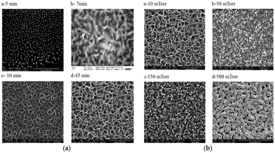 The presence of hexahedron-like particles (average size of 200 nm) appearing as stacks of many flat facets, was noticed. By further increasing the pressure, the particle size slightly decreased and the outer flat facets broke. By including a small oxygen percentage to the deposition atmosphere, the arise of very fine particles (~20 nm) was observed, as shown in Figure 2b. These were interconnected together, forming a porous network. When the total pressure increased to 10 mTorr, the film showed many clusters (~150 nm) made of fine particles (~50 nm). The metallic Zn films were further oxidized in air at 600 °C for 1 h to be totally converted into ZnO, as confirmed by XRD analyses. The morphologies of the resulting ZnO thin films were strongly correlated with the deposition conditions of the starting Zn films.