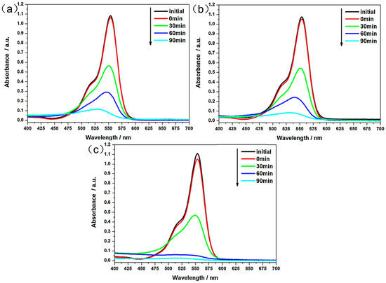 Absorbance spectra of Rhodamine-β dye aqueous solutions under UV irradiation, in presence of ZnO nanorod arrays (ZNRAs), synthesized for different electrodeposition times: (a) one time; (b) three times; and (c) six times. Reproduced with permission from [97]; Copyright 2014 Elsevier.