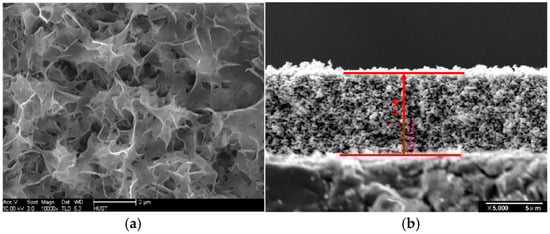 Examples of porous ZnO morphologies obtained by sol-gel methods. (a): a typical FESEM image of ZnO thin solid films deposited via a modified chemical bath deposition method. Scale bar is 2 μm. Reproduced with permission from [106]; Copyright 2006 Elsevier. (b): Cross-section FESEM image of ZnO films prepared at 0.05 mol/L methanolic zinc acetate solution and sintered at 500 °C. Scale bar is 5 μm. Reproduced with permission from [107]; Copyright 2005 Elsevier.