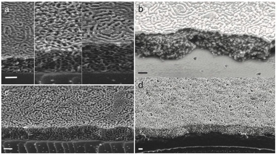 SEM of ZnO replication of the worm-like morphology: (a,c) worm-like PS template; (b) as-deposited ZnO-PS hybrid; (d) ZnO morphology after annealing at 400 °C followed by etching of the top compact layer. Scale bar are 200 nm. Reproduced with permission from [124]; Copyright 2014 John Wiley & Sons, Inc.