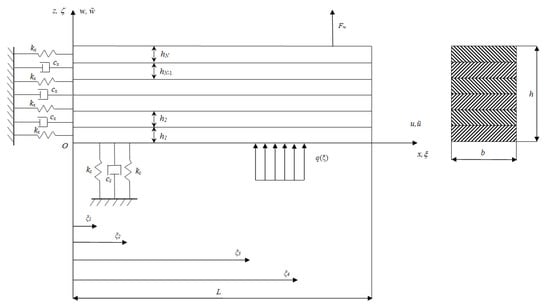 Kinematical parameters are the axial ũ and transversal beam displacement components, kx,z is the stiffness of the longitudinal and transversal distributed elastic constraints, cx,z is the viscosity of the longitudinal and transversal distributed viscous constraints, q and Fw are the distributed and concentrated external transversal loads, ρk, Ek, and Gk are the material, k-th layer, mass density, axial and shear moduli, and t is the time coordinate.