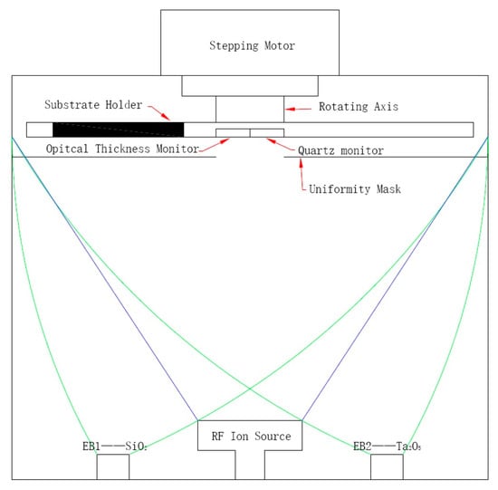 Figure 1 shows the schema of deposition system in present study, which is a traditional electron beam evaporation system (OTFC-1300, Optorun Co., Ltd., Kawagoe-shi, Japan), equipped with a three-Mo-grids RF ion source. The substrate, facing downward, was mounted on a spinning planetary holder. An optical thickness monitor and quartz thickness monitor were deployed in the center of the chamber to control the thickness and deposition rate, respectively. Electron beam evaporation sources and an RF ion source were deployed in the bottom of the chamber. Uniformity masks were used below the substrate holder to adjust the layer thickness distribution across the deposition area. After using the mask, uniformity was superior to ±0.1%.