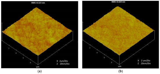 Figure 4 gives the surface profile before and after the reflector deposition measured by AFM. It can be seen that surface roughness decreased from 0.420 to 0.323 nm after the layer deposition. The coating process exhibited a planarization effect, which was also observed in the IBS deposition coating process [], while never being reported in the evaporation coating process. This planarization effect can be explained by the classic thin film growth dynamics: if deposited atoms do not have enough energy to migrate on the surface of substrates, the films would have porous microstructure and rough surface. On the contrary, energetic deposited atoms are capable of migrating long distance on the surface of substrates and stop at proper location with lowest surface energy. The films would possess dense microstructure and smoother surface. Present study used the energetic RF ion source to overcome the shortage of low energy electron beam evaporation. Thus, the deposition atoms can obtain enough energy by momentum transfer with the energetic ions.