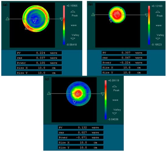 Figure 8a,b showed the surface figure of the substrates and post-deposited ultra-high reflector, respectively. The power value of the surface changed from 0.105λ to −0.224λ (λ = 632.8 nm). The multilayer exhibited compressive stress and the value is 452 MPa, which was fairly high. To compensate the surface figure change, SiO2 single layer were deposited on the backside of the reflector and the surface figure was controlled superior to 1/6λ (λ = 632.8 nm). Figure 8c was the final surface figure of the ultra-high reflector.