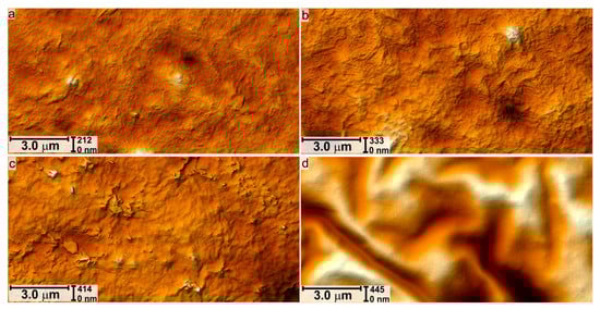 AFM images 15 × 7.5 μm2 of untreated (a) and treated with 1 keV, 2 × 1016 ion/cm2 (b); 1 keV, 2 × 1017 ion/cm2 (c); 1 keV, 3 × 1017 ion/cm2 (d) surfaces.