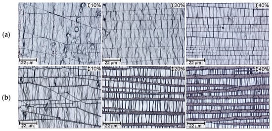 Optical images of PU after PIII 3-17 and fatigue loading (ε = 10%, 20%, 40%) in the unloaded (a) and stretched (b) states. The strain direction is vertical.