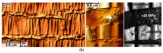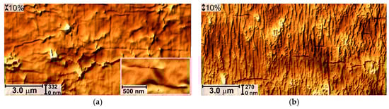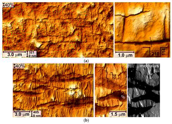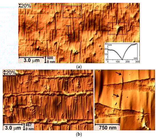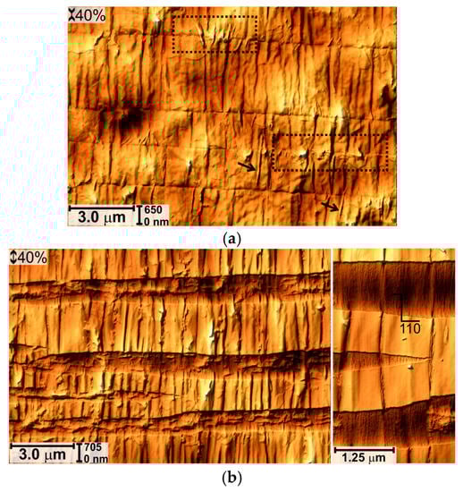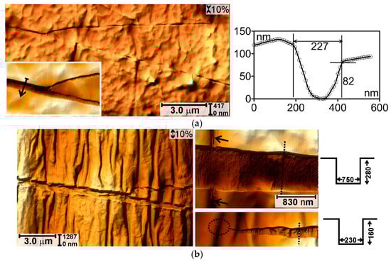 After ε = 40% open cracks (200–500 nm wide, 120–600 nm deep) appear on the unloaded material as well as longitudinal folds and fragments of the squeezed polymer (Figure 9a). The width of cracks on the stretched material is ~3.0 μm (Figure 9b). The surface is extremely heterogeneous, fragments of polymer and hard layer are visible in the cracks. Small cracks of submicron sizes are also observed on the tops of the longitudinal folds (indicated by the arrow in Figure 9b).