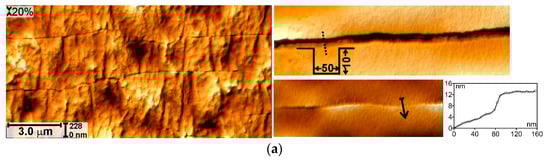 Let us investigate the damage of modified surface in greater detail. The surface after the 1-16 treatment and the fatigue loading 10%, in the unloaded state covered by straight open cracks (Figure 3a) with a depth of 10–100 nm and a width of 50–700 nm (the average values are given below in Table 1). Such a spread is related to an inhomogeneous deformation at small ε. The profile of such crack is shown in Figure 3a. The edges of the cracks are always located at different heights relative to each other. The depth of the crack is measured from the lowest one edge.