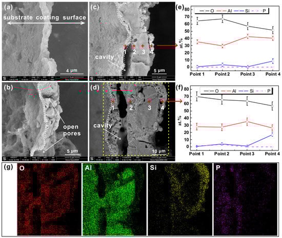 (a–d) SEM images of fracture cross section of PEO coatings formed at (a) 5 min, (b) 15 min, (c) 45 min, and (d) 60 min. (e,f) The corresponding EDS results to the coating of (c) and (d). (g) Typical EDS mappings of PEO coatings marked in Figure 1d.