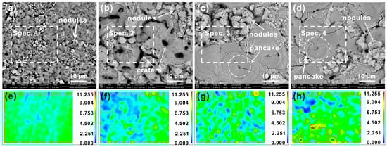 (a–d) Surface SEM (back-scattered electron mode) and (e–h) 3D color maps of PEO coatings formed at (a,e) 5 min, (b,f) 15 min, (c,g) 45 min, and (d,h) 60 min.