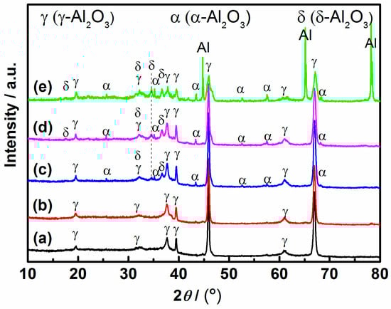 Figure 3 shows the XRD patterns of PEO coatings prepared at different times. Both the powder sample and PEO coating sample with the substrate formed at 60 min were used for the XRD test. As shown in Figure 3d,e, the only difference between the two was that the diffraction peak of Al was present in the coating sample with the substrate. In order to reduce the effect of the aluminum substrate on the XRD results, free-standing coatings were ground to powders for the XRD tests. During the initial stages (5–15 min), the major crystalline phase in the coating was γ-Al2O3. The coatings formed over a longer period (45–60 min) showed a presence of γ-Al2O3, α-Al2O3, and σ-Al2O3.