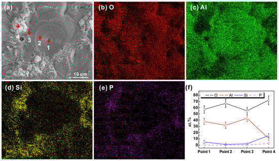 (a) Surface SEM images (secondary electron mode) of the PEO coating formed at 60 min. EDS mappings of (b) O, (c) Al, (d) Si, and (e) P. (f) Semi-quantitative analysis of element content at different locations marked in Figure 4a.