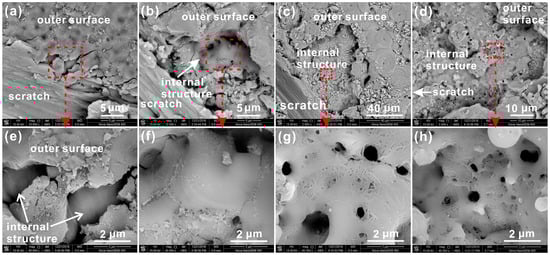 (a–d) SEM images (back-scattered electron mode) and (e–h) magnified SEM images of the internal structure of PEO coatings formed at (a,e) 5 min, (b,f) 15 min, (c,g) 45 min, and (d,h) 60 min.