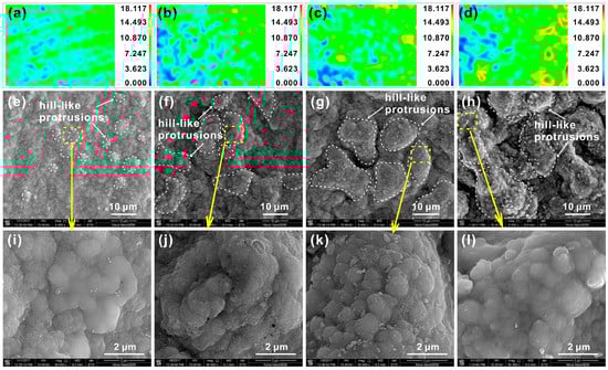 The 3D images (Figure 6a–d) displayed that the height difference at the aluminum/coating interface raised as the oxidation time increased. This transformation indicated that the “hills” had grown with the development of the PEO process. The sites of the hill-like protrusions reflected the depression locations in the aluminum substrate. Thus, the depth of oxidation of the aluminum substrate increased with the growth of the coating.