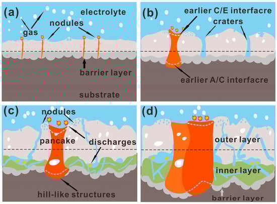 A growth and 3D structure model of the PEO coating at different stages: (a) breakdown of dielectric film under plasma discharges; (b) formation of PEO coating with open pores; (c) initial formation of three-layer structure; and (d) further evolution of three-layer structure.
