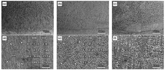 Figure 1 shows the cross section of the laser cladded Fe-based coatings at low magnification. It is obvious from Figure 1 that the laser cladded Fe-based coatings were dense and uniform with no holes, cracks or other defects. The average thickness of the laser cladded Fe-based coatings is 1440 μm, 1440 μm and 1600 μm, respectively, indicating that the elements of V and Cr rarely have influence on the thickness. Figure 2 shows the cross-sectional SEM view of Fe-based alloy coatings. The interfaces of the laser cladded coatings are shown in Figure 2a–c. It is clear that the microstructure of the three coatings presented a typical dendrite structure growing from the substrate. The microstructure near the interface of S1 and S2 was mainly composed of columnar dendrite phase, which of S3 was cellular dendrite. A layer of planar crystallization with a thickness of about 5 μm was found near the interfaces of the laser cladded layers, indicating that a good metallurgical bonding between the coating and the substrate was achieved. The microstructure in middle sections of laser cladded coatings is shown in Figure 2d–f. The coatings exhibited dendrites (area DR) and interdendritic region (area ID) microstructure. Using the quantitative metallographic method as reported elsewhere [27], the area fraction of dendrites in the area was measured with a result of 91.50%, 89.06% and 84.38%, indicating that the grain size decreased with the addition of Cr3C2 and FeV50. To figure out the distribution of alloy elements, EDS analysis was carried out as shown in Figure 1. It can be seen that the contents of main elements C, V and Cr in dendrites (area DR) were similar and were not varied with the addition of the Cr3C2 and the FeV50, indicating that C, V and Cr were almost saturated. However, the contents of C, V and Cr in the interdendritic region (area ID) presented a trend of increase with the increase of Cr3C2 and FeV50 content.