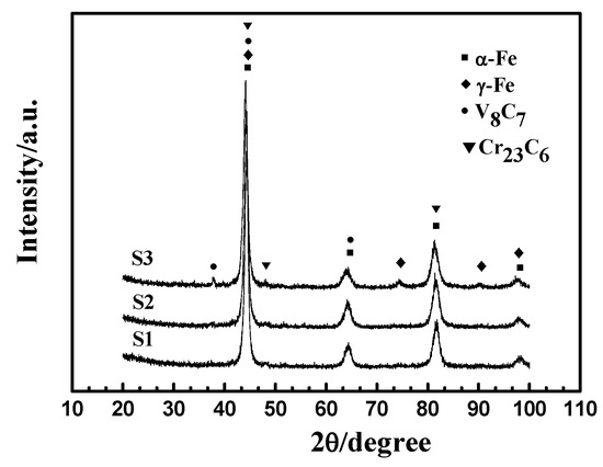 Figure 3 shows the XRD spectra of Fe-based alloy coatings. It is obviously observed that the S1 and S2 were composed of α-Fe solid solution and Cr23C6 phase. With the increase of Cr3C2 and FeV50, the diffraction peaks of γ-Fe and V8C7 also appeared besides the α-Fe solid solution in the XRD spectrum of S3. In addition, the content of C, V and Cr elements increased with the addition of Cr3C2 and FeV50 in ID; therefore, it is reasonable to deduce that V8C7 and Cr23C6 existed in the ID region of S3. The presence of γ-Fe in S3 can be explained as: (a) the diffusion velocity of V and Cr elements in ferrite was slower than other phases such as austenite and martensite, so that the diffusion of C element was hindered by the high content of V and Cr, which resulted in the formation of the carbon-rich areas (b) due to the rapid melting and solidification through the laser cladding process, and the molten pool could not homogenize before solidified completely. A mass of C elements generated by decomposition of Cr3C2 gathered in a carbon-rich area. The Ms (martensite transformation temperature) points of martensite in these areas were reduced where the austenite showed a higher stability [31]. In addition, as shown in Table 3, the diffraction angle (2θ) of α-Fe decreased and the 2θ displacement increased with the addition of Cr3C2 and FeV50, which indicated that the lattice distortion in α-Fe solid solution was increased.