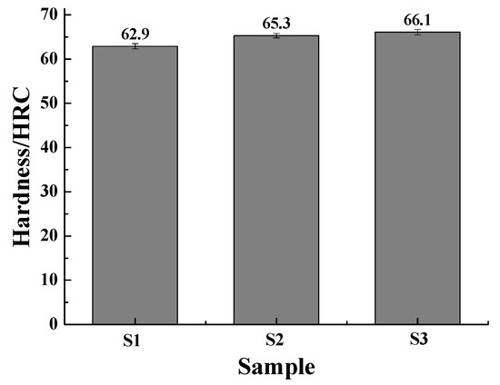 Figure 4 shows the hardness of the Fe-based alloy coatings. It made evident that the average hardness of coating samples increased with the addition of Cr3C2 and FeV50. The average hardness for S1, S2 and S3 was 62.9 ± 0.6 HRC, 65.3 ± 0.5 HRC and 66.1 ± 0.6 HRC, respectively. In addition, the hardness achieved in coatings prepared by laser cladding in the current study was much higher than the other similar coatings, which was reported in different literature. It has reported a microhardness of 650 HV for H13 tool steel laser coating and 659 HV for AISI 420 martensitic stainless steel laser coating [32]. The high hardness was mainly attributed to the high solid solubility of C, V and Cr elements. The rapid solidification of the laser cladding process led to an extension of the solubility limit [33]. Increasing C, V and Cr atoms increase lattice distortion and improve the effect of solid solution strengthening, which was consistent with the XRD results [34]. The differences among the average hardness of the three laser-cladded coatings were related to the disparities of grain size caused by the different content of V and Cr [35]. The improvement of yield strength could be quantified by the classic Hall–Petch equation below [36]: