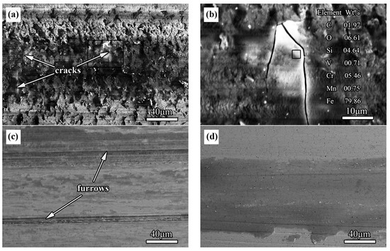 To illustrate the wear mechanisms of the coatings, the worn surfaces are characterized by SEM as shown in Figure 5. It can be clearly seen that the worn surface of S1 was characterized by vestiges of material spalling and plastic deformation (see Figure 5a). In addition, cracks vertical to the worn scar were observed. During sliding, the cracks may spread when they were subjected to the combined effect of normal force and tangential force, leading to material spalling. The EDS analysis was taken on the surface of worn scars. The results indicated that the worn surface contained high levels of oxygen (see Figure 5b), indicating that oxidation occurred on the worn surface. The oxide debris may adhere to the worn surface, which caused abrasive wear during reciprocating wear. This indicated that the wear mechanism of S1 was composed of abrasive, adhesive and oxidative wear. The worn surface of S2 was shown in Figure 5c. It is noted that the typical furrows of abrasive wear were observed and the worn surface of S2 was smoother than S1. The EDS analysis indicated that the worn surface was highly enriched in Fe, V, Cr and Si, with little O element detected. Therefore, the mechanism of S2 was mainly composed of abrasive wear and adhesive wear. The wear mechanism of S3 was similar to the S2, except that the width and depth of the ploughed furrow decreased as shown in Figure 5d. The main reason for having extremely strong contrast existing among them was the contribution of high hardness and different microstructure characteristics caused by various grain sizes [35]. The previous study demonstrated that strain mainly concentrates close to the grain boundaries; therefore, a material with a larger grain size cracked more easily than those with fewer grain boundaries [42], which meant that the grains with small size can prevent cracking. In addition, the high hardness can resist the ploughing of abrasive grains spalled off from the worn surfaces.