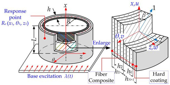 In this theoretical model, “1” refers to the direction parallel to fiber orientation, “2” refers to the direction perpendicular to fiber orientation (also known as fiber transverse orientation). λ(t) is the base excitation applied on the shell, and w(x, θ, t) is the vibration displacement in any response point Rc(x1, θ1, z1), as shown in Figure 1. If the hard coating is regarded as a specific layer of the shell, the coordinate of thickness direction of each layer can be represented by h1, h2, …, hk, hN, hN+1 (k = 1, 2, …, N, N + 1) from the lower surface to upper surface. In addition, N is the number of total layers including hard coating, while N-1 is the number of fiber-reinforced layers.
