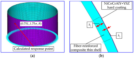 A carbon/epoxy composite thin shell with NiCoCrAlY + YSZ hard coating is studied, and both the finite element method and the analytical method presented are employed to establish the corresponding theoretical models. There are 25 layers of FCTS with hard coating, where the upper layer is hard coating and the lower layers are fiber reinforced composite. Fiber-reinforced composite is symmetrically laid, which has a total of 24 layers with the laminate configuration of [(45°/−45°)12], and each layer has the same thickness and fiber volume fraction. The corresponding geometric and material properties of the FCTS and hard coating are listed in Table 1. The material property of the FCTS is listed in Table 2. And material property of hard coating is that = 54 GPa, = 0.0212, = 0.3, and ρc = 5600 kg/m3.
