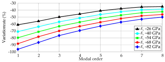 From the above results, it can be found that: (1) When the above elastic modulus values are selected, the natural frequencies of FCTS with hard coating decrease firstly before increasing with the increase of the elastic modulus of hard coating. The increased levels of natural frequencies become larger with the increase of modal order; (2) The resonant responses of FCTS with hard coating decrease with the increase of the elastic modulus of hard coating. Meanwhile it can be seen from Figure 4 that there are much more reduced rates in the corresponding resonant response results in the lower modes compared with response results in the higher modes, which means that the increase of the elastic modulus of hard coating has a better damping effect on the lower modes of FCTS with hard coating; (3) The modal loss factors of FCTS with hard coating increase with the increase of the elastic modulus of hard coating. However, the increased levels of the modal loss factor of FCTS with hard coating in the higher modes are smaller than the results of the lower modes.