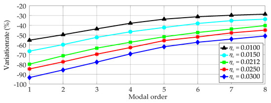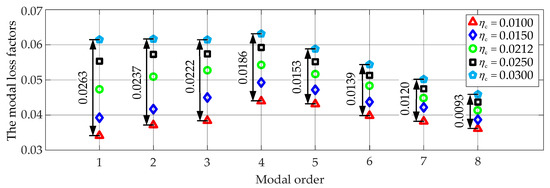 In this section, the loss factor of hard coating is chosen as 0.01, 0.015, 0.0212, 0.025, and 0.03, and other parameters of the FCTS are set to be constants. The Equation (28) shows that the natural frequencies of the FCTS with hard coating can be affected by the real part of the stiffness matrix and the mass matrix. However, the loss factor of hard coating has no influence on these two matrices, so it is not responsible for the change of natural frequencies of the composite shell. Besides, the imaginary part of the stiffness matrix can be affected by the loss factor of hard coating. Therefore, this coating material does have the damping effects on the resonant responses of the composite shell. Here, the first eight resonant responses and the modal loss factors corresponding to different loss factors of hard coating are calculated, and the relevant results are listed in Table 8, Figure 6 and Figure 7.