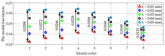 Finally, the hard coating thickness is set to be 0.01, 0.02, 0.03, 0.04, and 0.05 mm so as to study the effect of the thickness of hard coating on vibration characteristics when the other parameters of the FCTS are set to be constants. The first eight natural frequencies, resonant responses, and the modal loss factors of the FCTS with hard coating are calculated, and the relevant results are listed in Table 9 and Table 10, Figure 8 and Figure 9.