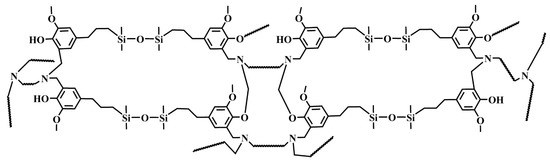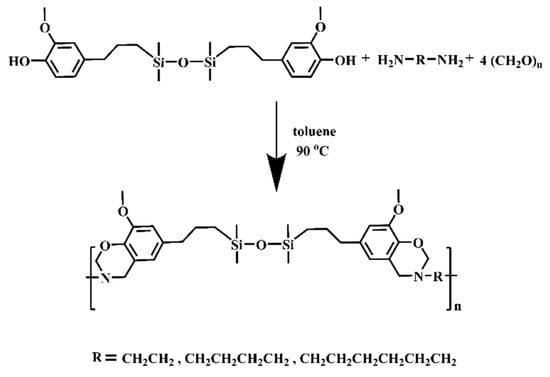 The following were all purchased from Aladdin Reagent (Shanghai, China): 1,1,3,3-tetramethyl disiloxane (99%), chloroplatinic acid hexahydrate (99%), toluene (99%), petroleum ether (99%), and isopropyl alcohol (99.5%). The following were obtained from Zhejiang Guoguang Biochemistry Co., Ltd. (Hangzhou, China): 1,2-ethylenediamine (99%), 1,4-butanediamine (99%), 1,6-hexanediamine (99%), paraformaldehyde (95%), and dioxane (99.5%). All the chemicals were used as received without any purification. According to the procedures described previously, 4,4′-(1,3-dipropyl-tetramethyldisiloxane) bis-2-methoxyphenol (SIE) (Figure 1) was synthesized by the hydrosilylation of eugenol with 1,1,3,3-tetramethyldisiloxane [44]. Before the following reaction with amines, its chemical structure was identified in detail.
