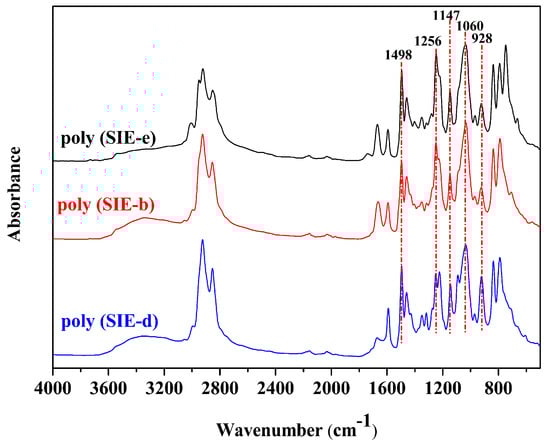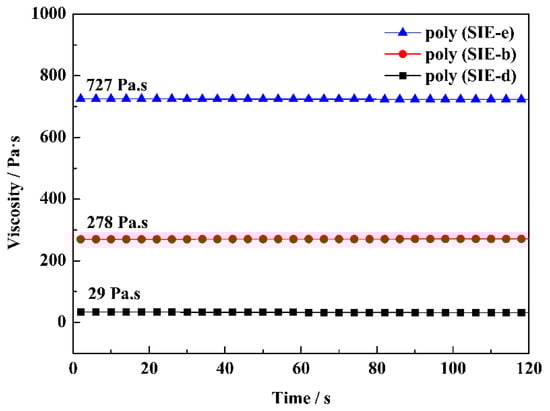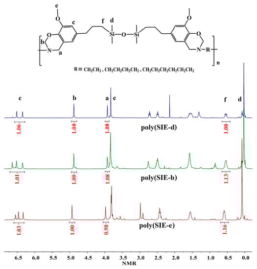 The FT-IR spectra of poly (SIE-e), poly (SIE-b), and poly (SIE-d) are shown in Figure 3. They showed quite similar absorption peaks. In Figure 3, the strong band shown at around 1060 cm−1 was due to the Si–O–Si stretching [51], and the peak at 1147 cm−1 indicated the presence of C–N–C. For the peak at 1256 cm−1, it was assigned to the antisymmetric stretching of C–O–C in the oxazine ring [20] and the characteristic signal for C–H stretch of benzene was shown at 928 cm−1. The absorption band centered at 1498 cm−1 corresponded to the trisubstituted benzene ring vibration. In order to make a further structure confirmation, the 1H-NMR spectra of poly (SIE-e), poly (SIE-b), and poly (SIE-d) are shown in Figure 4. The characteristic peaks of benzoxazine corresponding to the methylene units in oxazine rings (O–CH2–N and Ph–CH2–N) were observed at 3.93–3.97 ppm and 4.89–4.94 ppm [41], respectively. The characteristic peaks for aromatic protons were shown in the range of 6.33–6.57 ppm. Based on the characteristic peak assignment and their integral shown in Figure 4, the formation of target products could be confirmed. As shown in Table 1, the number-average molecular weight (Mn) of all the oligomers were ranged from 955 to 1261 g/mol, which indicated the average number of repeating units was about 2. In addition, the viscosity is also an important factor determining the application of organic coating. As shown in Figure 5, the viscosity of poly (SIE-e,f), poly (SIE-b,f), and poly (SIE-d,f) were 727, 278 and 29 Pa·s, respectively. Due to the longest aliphatic units in poly (SIE-d,f), it exhibited the lowest viscosity. The relatively low viscosity at 30 °C ensured their good film-forming properties.