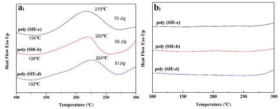 In order to explore the optimal curing conditions, the curing behaviors of poly (SIE-e), poly (SIE-b), and poly (SIE-d) were monitored by DSC. As shown in Figure 6a, the DSC curves for all the samples presented a single broad exothermic peak, which corresponded to the ring-opening polymerization of the oxazine ring. As a general rule, the peak temperature for DSC exothermic curves is usually taken as an indicator to evaluate the curing reactivity. The lower the temperature of the peak, the higher the reactivity of the component [53]. In Figure 6a, the onset curing temperatures for poly (SIE-e), poly (SIE-b), and poly (SIE-d) were as low as 134 °C, 135 °C, and 132 °C, and their peak curing temperature were 215 °C, 220 °C, and 224 °C, respectively. Compared with the conventional benzoxazines, the onset curing temperatures for these bio-based benzoxazine oligomers were much lower [54]. The reason might be due to the existence of phenol or primary amine end groups in the molecular chain, which could catalyze the curing reaction and then decrease the starting curing temperature [55]. And the trace impurity also might decrease curing temperature. As marked in Figure 6a, the exothermic enthalpy values of poly (SIE-e), poly (SIE-b), and poly (SIE-d) were about 70, 55, and 51 J/g respectively, corresponding to a ΔH of 56 kJ to 73 kJ per mole of benzoxazine ring, which was in good accordance with the widely accepted enthalpy value for the benzoxazine ring opening reaction. Figure 6b showed the DSC curves for poly (SIE-e), poly (SIE-b), and poly (SIE-d) after the curing reaction and no more exothermic peaks were observed in the range of 200–250 °C, which confirmed the full polymerization of oxazine rings. However, a deviation of the base line was observed for all the systems when the temperature was increased to higher than 270 °C, which might be caused by the post-curing or the thermal degradation of cured resins at higher temperature [32,56].