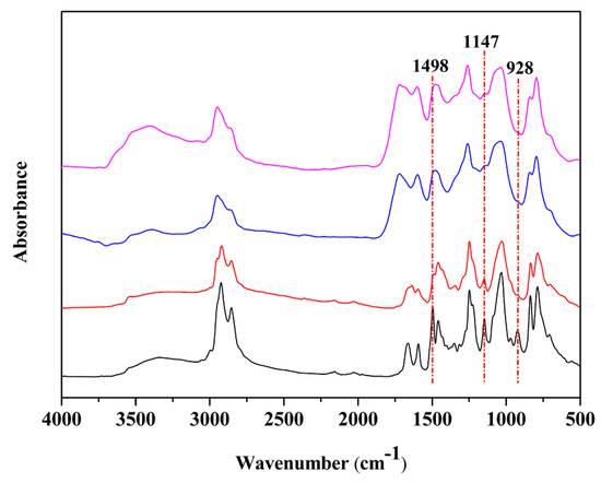 The infrared spectrum (FT-IR) was collected with NICOLET 6700 FTIR (NICOLET, Thermo Fisher Scientific, Waltham, MA, USA) using the KBr pellet method. The spectra were recorded from 400 to 4000 cm–1 with a resolution of 4 cm–1 and 32 scans were collected for each sample. The samples were prepared by dissolving a small amount of compounds in chloroform, then smearing the solution onto a KBr crystal plate and evaporating the solvent at the higher temperature (40 °C) completely.