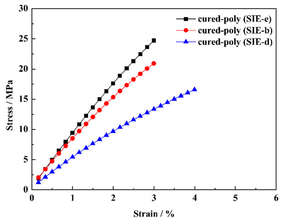Generally, the tensile properties of polybenzoxazine are difficult to measure, due to its inherent high brittleness. However, in this work the cured benzoxazine oligomers demonstrated high flexibility. As shown in Figure 9, all the polybenzoxazine films could be completely folded. The stress–strain curves of cured-poly (SIE-e), cured-poly (SIE-b), and cured-poly (SIE-d) are shown in Figure 10 and related values are collected in Table 2. The tensile strength of cured-poly (SIE-e), cured-poly (SIE-b), and cured-poly (SIE-d) were 24.7, 20.9, and 16.6 MPa, respectively, with an elongation upon breaking of 2.9%, 3.0%, and 3.9%. It was noted that when the length of diamine was increased, from 1,2-ethylenediamine to 1,6-hexanediamine, the tensile strength of cured benzoxazine resins was decreased accordingly, and their elongation upon breaking demonstrated the opposite tendency.