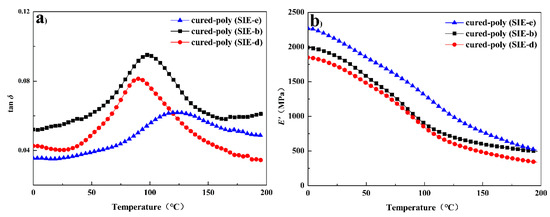 where E’ is the storage modulus of the cured samples in the rubbery plateau region at 190 °C (much higher than Tg), R is the gas constant, and T is the absolute temperature. The calculated crosslink density for the cured resin was listed in Table 2. As expected the crosslink density was decreased in the order: cured-poly (SIE-e) cured-poly (SIE-b) cured-poly (SIE-d). As we know, the height and width of tan δ peak provides valuable information. Usually, the broader peak of tan δ is associated with the inhomogeneous features and the lower tan δ peak reflects the weaker segment mobility of the network. In Figure 11a, the lowest tan δ peak was observed for cured-poly (SIE-e), which was in good accordance with its highest Tg. The relatively broader peaks of tan δ might be helpful for the flexibility of these cured systems.
