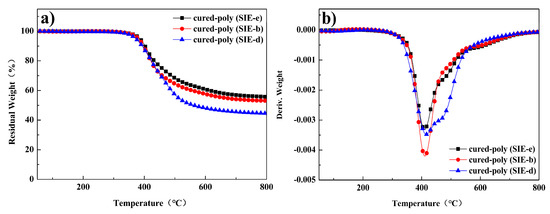 TGA was performed to investigate the thermal stability of the cured oligomers and Figure 12 is the TGA curves under nitrogen atmosphere. It can be seen that all the cured samples remained stable before 350 °C and their degradation temperatures for 10% weight loss (Td10%) ranged from 392 °C to 402 °C, which indicated their good thermal stability. The char yields at 800 °C (R800) for all the samples are also listed in Table 2. The value of R800 was varies from 45% to 56% and in the order of cured-poly (SIE-e) cured-poly (SIE-b) cured-poly (SIE-d). This was due to the fact that in the sample containing shorter aliphatic diamine units, the aromatic and siloxane segments contents were relatively higher, which could result in a higher char yield at elevated temperature [60].