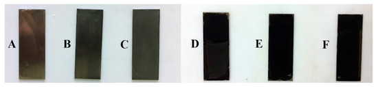 Digital photographs of benzoxazine coatings before and after curing reaction: (A) for poly (SIE-e); (B) for poly (SIE-b); (C) for poly (SIE-d); (D) for cured-poly (SIE-e); (E) for cured-poly (SIE-b); and (F) for cured-poly (SIE-d).