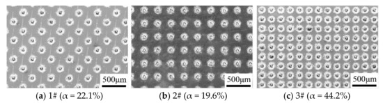 Geometrical parameters and distribution should be first determined prior to fabrication. Laser fabrication presents advantages in terms of time-saving, low cost, and high efficiency. In this study, laser surface texturing was conducted on the 65Mn steel surface by using Nd:YAG pulse laser (wavelength of 1064 nm, laser frequency of 10 kHz, and pulse width of 5–25 ns). Different densities (19.6%, 22.1%, and 44.2%) of samples were designed to obtain the best area density. The geometries of the micro-dimple are summarized in Table 2. The concrete array and their geometrical texture parameters are illustrated in Figure 2. Figure 2a–c shows the SEM (manufacturer, city, country) images of the textured plates, respectively. Figure 2d,e reveal the 3D image and cross-section profiles of a single dimple, respectively. The edge of dimples were slightly higher than the height of the plate because of laser processing (Figure 2e). The high-energy action of the pulse laser resulted in ejection of the heated metal from the plate as well as partial deposition of the metal on the brim of the dimples. Prior to the wear test, the surface was polished to remove asperity on the brims. The radius of the single dimple was 150 μm, and the depth was approximately 30 μm.