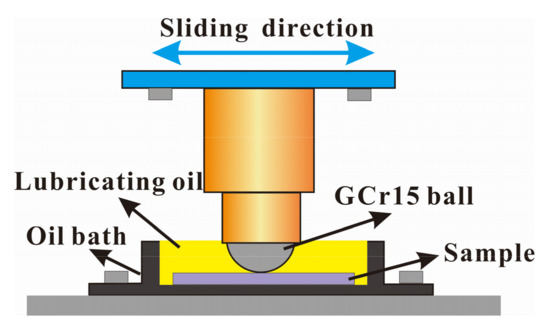 Friction and wear tests were conducted using GCr15 balls as the upper sample, with a diameter of 9.525 mm and hardness of 750 HV, as well as 65Mn plate as the lower sample, with dimensions of 25 mm × 14 mm × 6 mm and a hardness of 270 HV. The samples were purchased from Jinfu Mechanical and Electrical Center (Chengdu, China). The roughness of the balls was 0.4 μm, and the plate roughness was 1.5 μm. The entire wear process was performed on a UTM-2 tribo-tester under the following conditions: sliding speed of 5 mm/s, distance of 8 mm, normal load of 10 N, test time of 6000 s, and three temperature levels (room temperature of 25 ± 2 °C, 100 °C, and 175 °C). The lower plate sample was fixed in a square tank equipped with lubricating oil and remained stationary. The bottom of the tank was fitted with a heat device that can control and measure the experiment temperature. The illustration of the tribometer is shown in Figure 3. The specimens were cleaned with acetone and ethanol and then dried before each test. The tribological properties of the textured and untreated surfaces were tested under base oil (PAO4) and DS nanoparticles (0.01 wt %) well-dispersed in oil. To improve dispersibility, 1 wt % Span 80 (C24H44O6, Chengdu Changzheng Glass Co., Ltd., Chengdu, China) was utilized as a dispersing agent. This results have been shown in other work [22,23]. The morphologies of the worn surfaces were analyzed through optical microscopy (OM, OLYMPUS BX50, Tokyo, Japan), SEM (JSM-7001F, JEOL, Tokyo, Japan), Raman spectrum (Lab Ram HR, Horiba Ltd., Kyoto, Japan) characterization, energy-dispersive X-ray spectroscopy (EDX, EDAX-7760/68M, Amptek, Bedford, MA, USA) and X-ray photoelectron spectrum (XPS, thermo-250Xi, Thermo Scientific, Waltham, MA, USA). The wear volume and wear rate are calculated by their 2D profile.