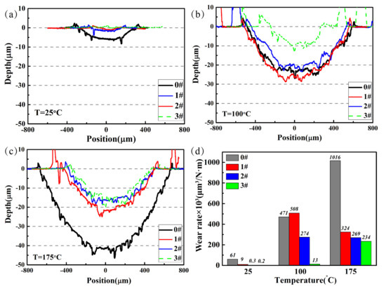 Cross-section profiles of the worn plates at varied temperatures: (a) T = 25 ºC; (b) T = 100 ºC; (c) T = 175 ºC; (d) wear rate of different samples at varied temperatures.